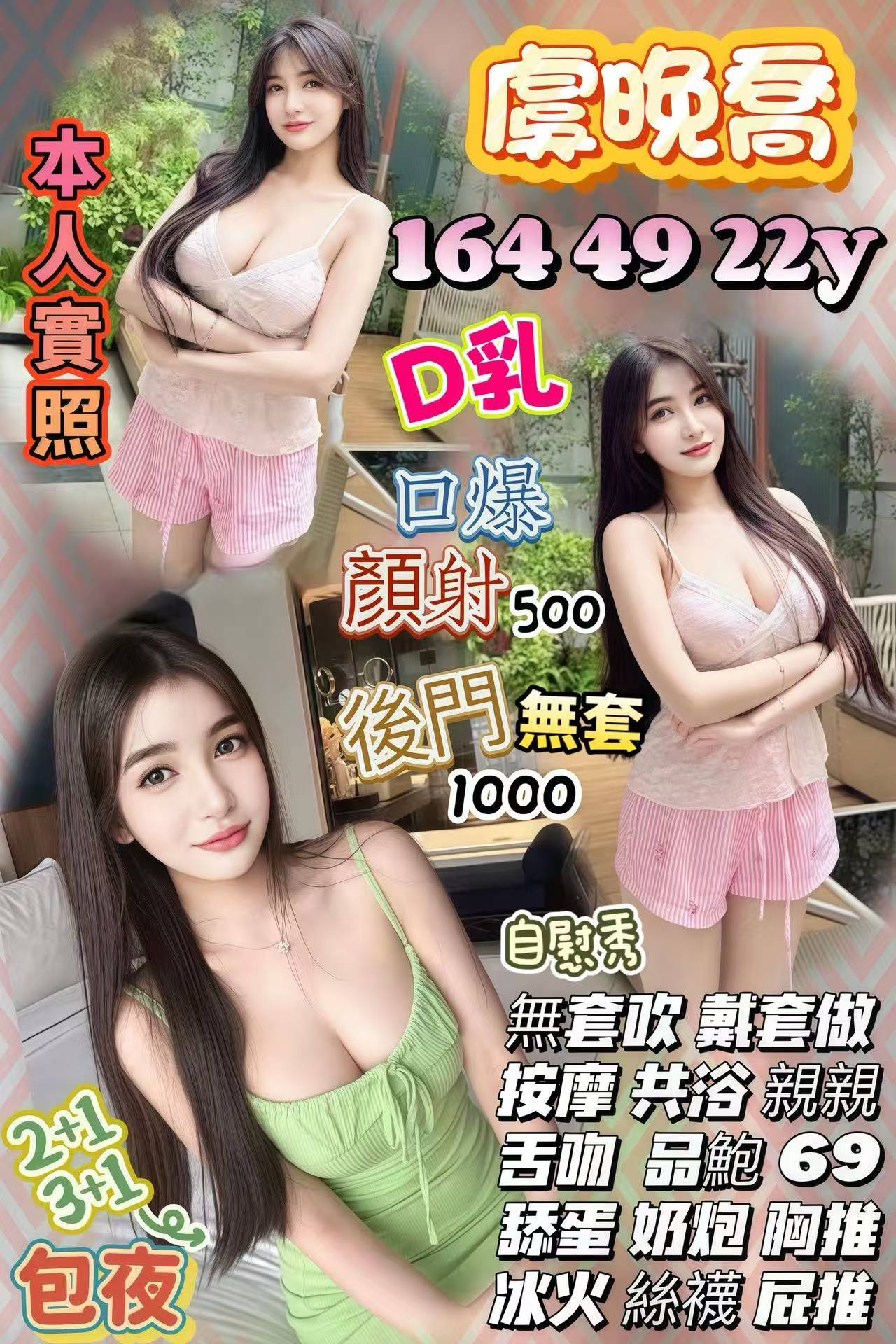 口爆+500 顏射+500 後門+1000 無套做+1000 自慰秀+500 2+1S 3+1S 5+3NS