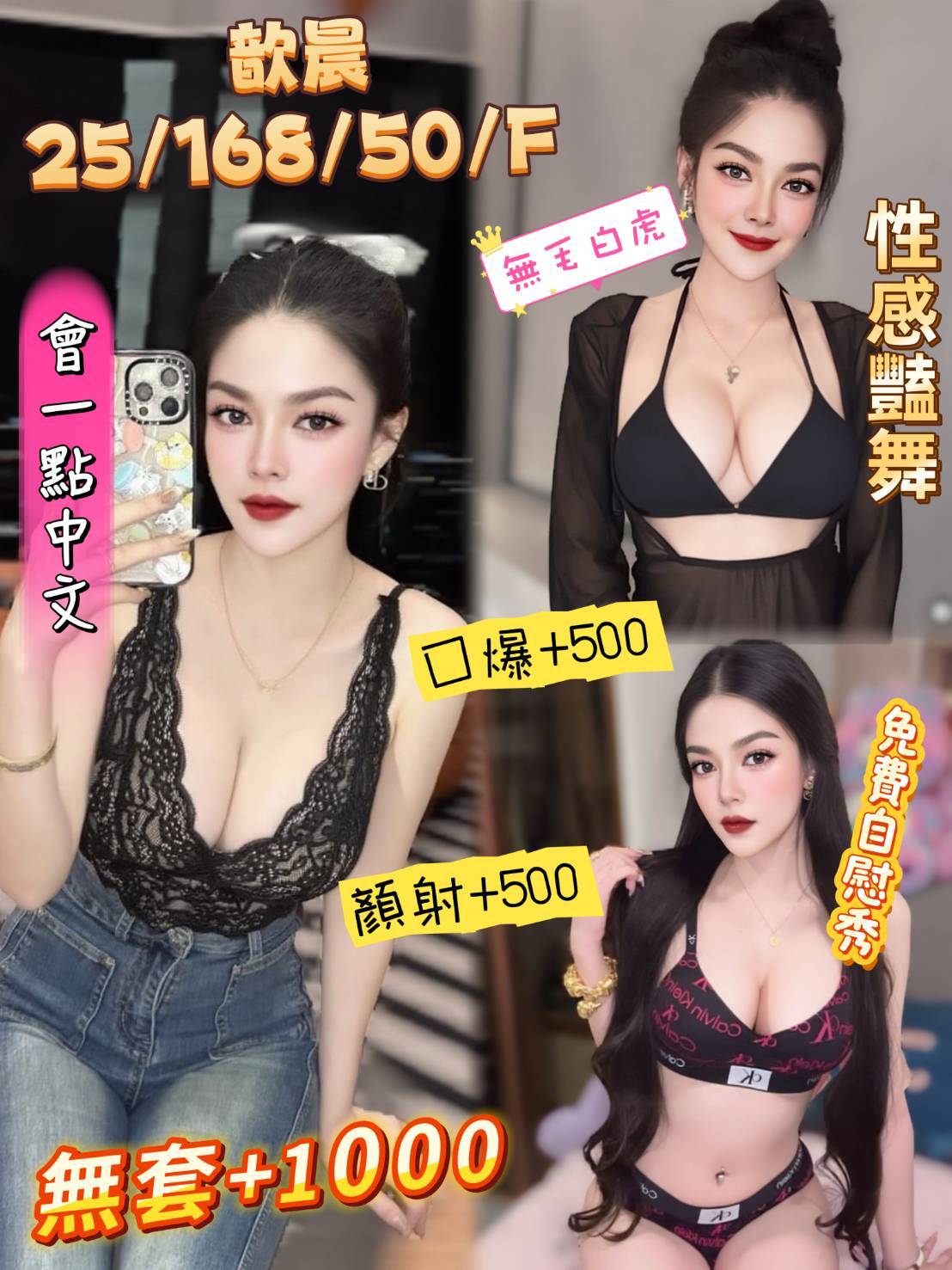無套吹 共浴 親嘴 舌吻 品鮑 六九 按摩 奶炮 舔蛋 豔舞 自慰秀 絲襪 情趣用品