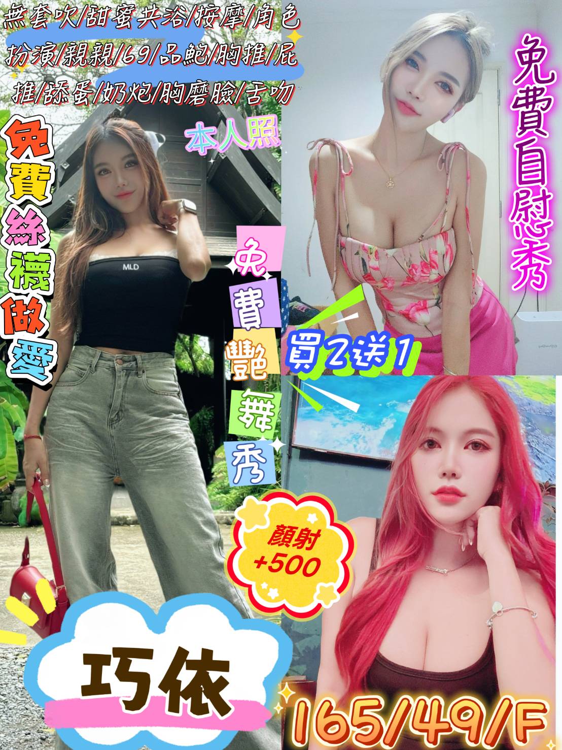 無套吹 共浴 按摩 角色扮演 親親 69 品鮑 胸推 屁推 舔蛋 奶炮 胸磨臉 舌吻 絲襪 自慰秀 艷舞 高跟鞋 睡衣(自備)