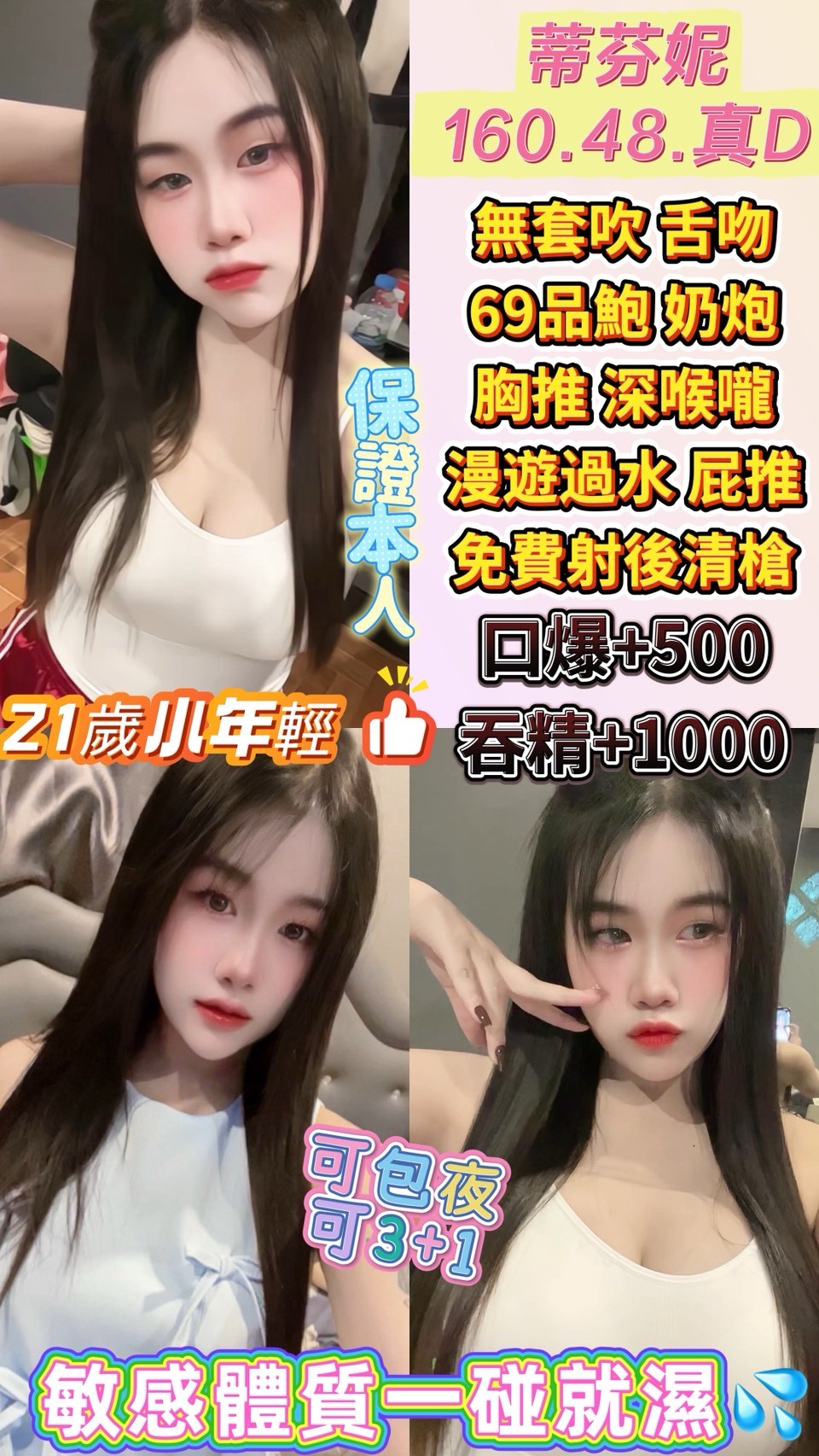 無套吹 共浴 親親/舌吻(視衛生) 舔蛋 69品鮑 水中蕭 深喉嚨 胸推 屁推 奶泡 按摩 漫遊過水 射後清槍 情趣用品/情趣內衣(自備)